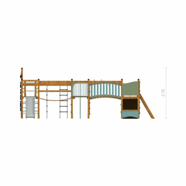 Dette lekeapparatet er bygget med en kombinasjon av lerketre, rustfritt stål, galvanisert stål, resirkulert HDPE, forsterket og mykt PP-tau, sklisikker vanntett kryssfiner samt elementer av PP og PE. Materialvalget sikrer både soliditet og motstandskraft mot vær og vind, samtidig som det gir en naturlig og innbydende estetikk. Hver detalj er nøye utvalgt for å tåle intensiv bruk og for å fremheve det naturlige uttrykket i uterommet.