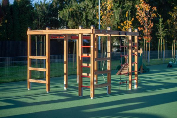 Dette klatrestativet er produsert av lerketre, pulverlakkert stål, forsterket og mykt PP-tau, HDPE, PP og PE. Materialvalget sikrer høy slitestyrke, værbestandighet og lang levetid, slik at produktet tåler mange års intensiv bruk utendørs. Kombinasjonen av naturmaterialer og moderne kompositter gir et solid, trygt og estetisk tiltalende innslag på enhver lekeplass.
